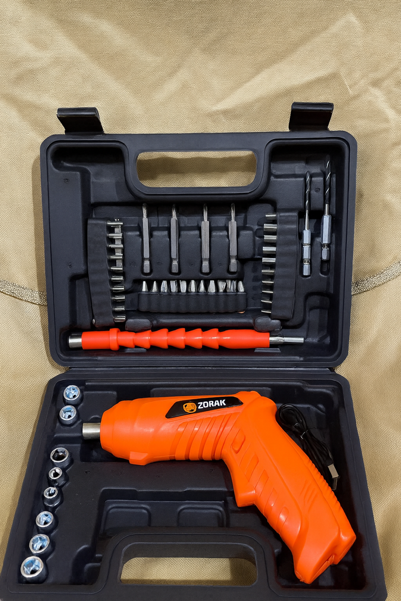 ZORAK Rechargeable Electric Screwdriver is designed for fast, effortless, and accurate fastening. With its powerful motor, ergonomic grip, USB charging, and complete 47-piece accessory kit, it is the perfect tool for technicians, electricians, mechanics, DIY users, and home repairs.